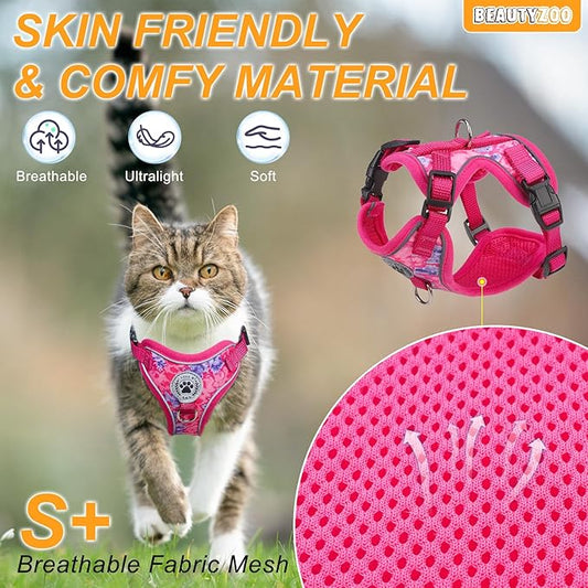 BEAUTYZOO Escape Proof Cat Harness and Leash for Walking, Soft Adjustable Cute Vest for Small to Large Cats, Reflective Breathable Easy-Control Outdoor Jacket, Kitten Harness and Leash Set, Rose, S