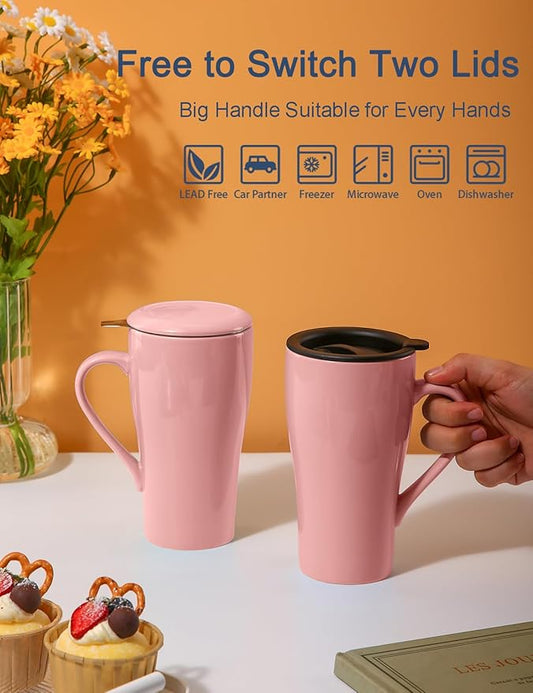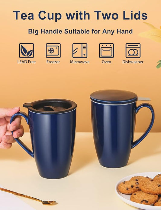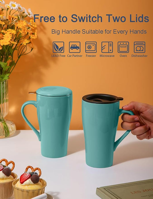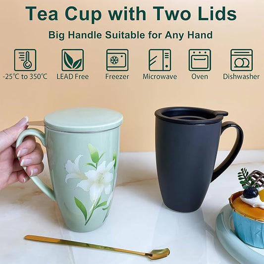 Tea Cup with Infuser and Lid, 17 oz Large Tea Infuser Mug with 2 Lids, Ceramic Teacups for Women, Men, Kids, Loose Leaf, Gifts