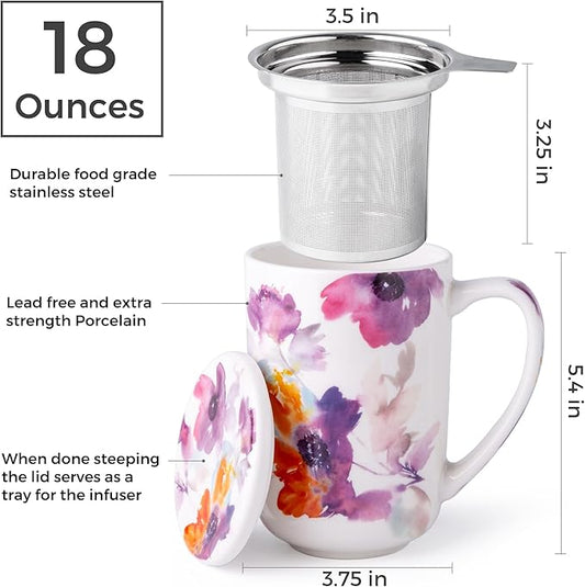 Tea Cup with Infuser and Lid, 18oz Large Steeper Mug, Ceramic Tea Infuser Mug with Silicone Lid, Teacup for Home, Office, Dishwasher & Microwave Safe (Lilac)