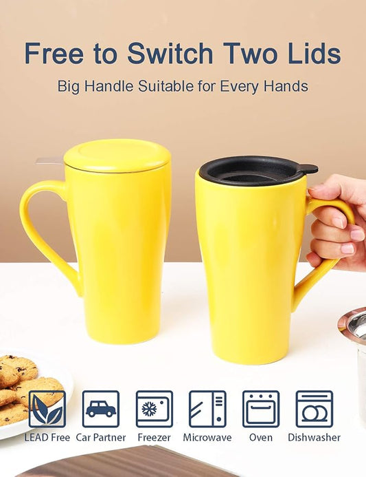 Tea Mug with Infuser and 2 Lids, 18oz Large Tea Infuser Cup, Tea Strainer Mug for Loose Leaf, Ceramic Travel Mug with Teabag Holder (Yellow)