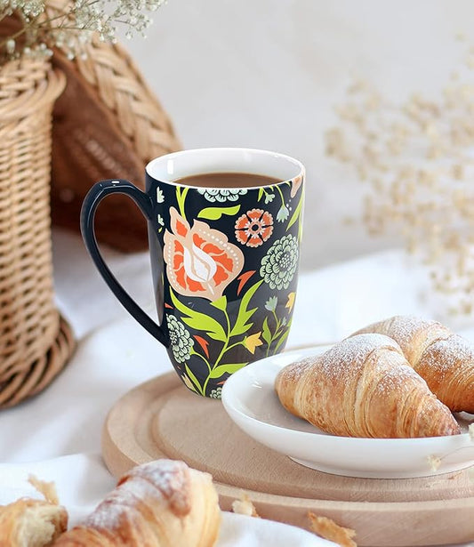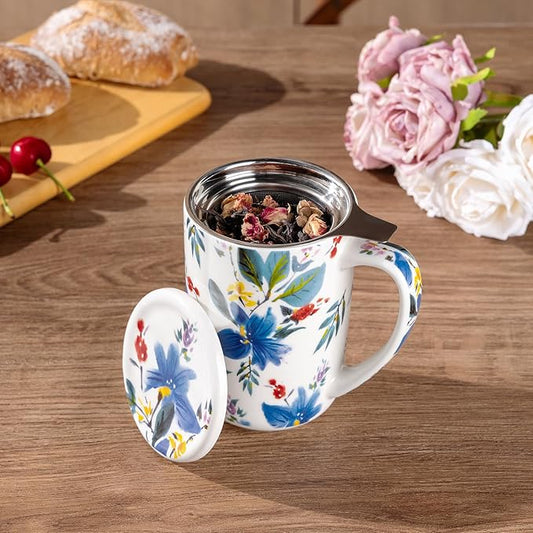 Tea Cup with Infuser and Lid - Tea Mug with Lid for Steeping Loose Leaf Coffee Milk Women Office Home Gift 16oz Navy Flower
