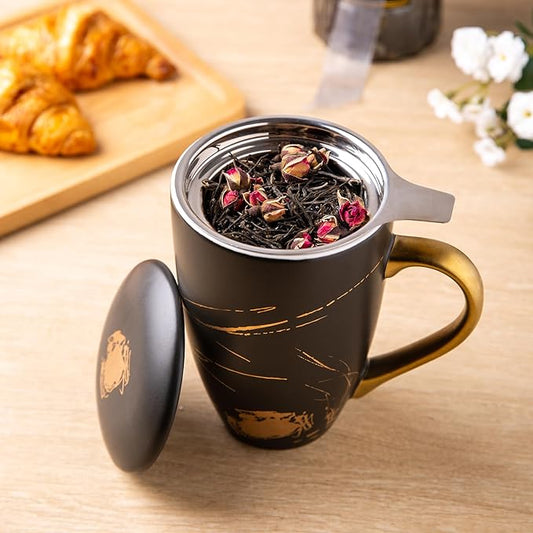 AmorArc Ceramic Tea Cup with Infuser and Lid, 17 Oz, Ceramic Cup with Handle for Steeping Loose Leaf Teas, Steeping Tea Mug with Strainer, Black