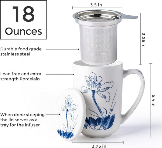 AmorArc Porcelain Tea Mug with Infuser and Lids, 18 Oz Large Cup Strainer with Bag Holder for Loose Leaf Tea, Steeping Coffee Mug for House-warming Wedding Birthday Gift