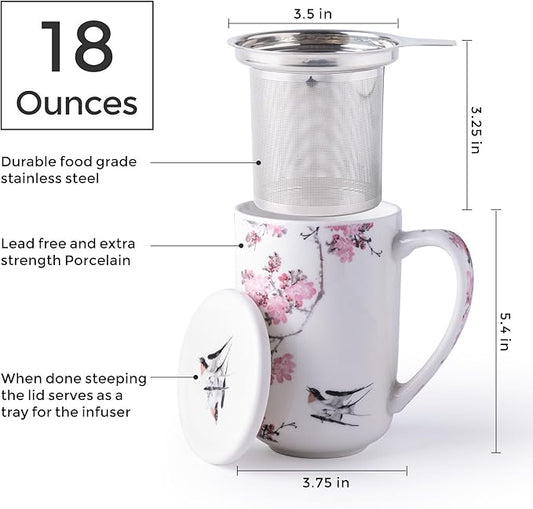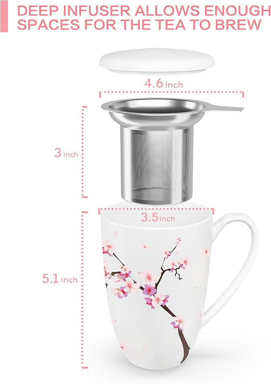 Tea Cup with Infuser and Lid for Steeping Loose Leaf Tea Bag Coffee Milk Women Office Home Gift 16oz Peach Blossoms