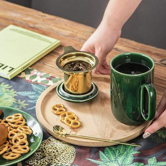 Tea Infuser Cup, 17oz Porcelain Large Tea Mugs with Infuser and Lid for Housewarming, Graduation, Retirement, Lily Green