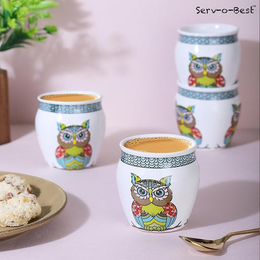 Handmade Ceramic Tea Cups Set – 6 Desi Kulhad Chai/Coffee Cups (5 oz Capacity), Lead-Free, Dishwasher & Microwave Safe, Glazed, Glossy finish Clay Tea Cups/kulhar/kullar - Owl Design
