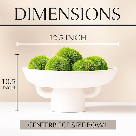 Luxurious White Textured Ceramic Bowl and Greenery Set,12.5x10.5 Inch Pedestal Decorative Bowl, with 6 Green Succulent Moss Balls, Counter Top, Farmhouse Table Centerpiece, Living Room, Kitchen Decor