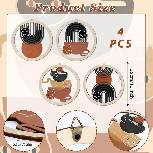 HPNIUB Boho Black Cat Wall Decor, Farmhouse line Geometric Coffee Tea Hanging Wooden Wall Art, 4 Pieces 10''x10'' Mid Century Abstract Sun Wood Sign for Nursery Bedroom Decoration, Lovely Cat Gifts