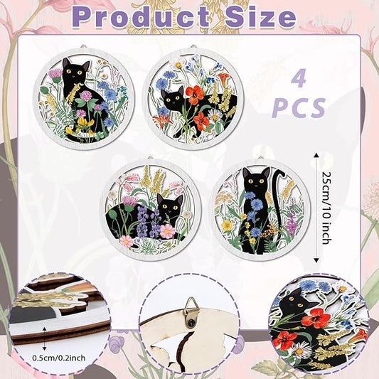 HPNIUB Funny Black Cat Wall Decor,Farmhouse Floral Wooden Signs,4 Pieces 10''x10'' Colorful Botanical Kitten Wall Art,Plant Cat Wood Plaque Home Decor for Pet Shop,Nursery,Lovely Cat Gifts