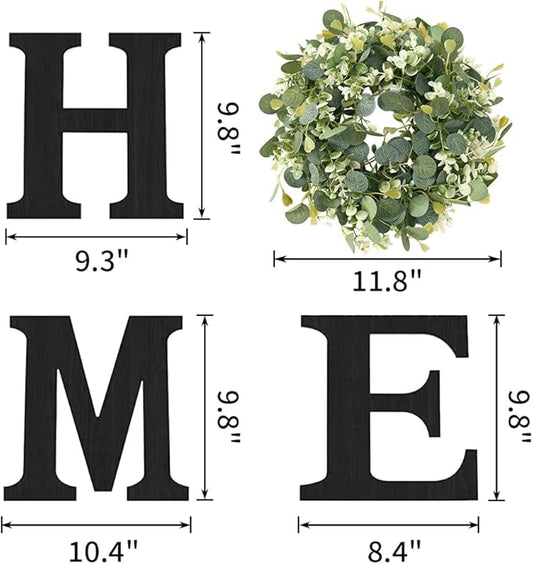 Wood Home Sign with Artificial Eucalyptus Wreath for O, Hanging Farmhouse Wall House Decor Wood Letters for Wall Art Rustic Home Decor, Wall Decor for Living Room Kitchen Entryway (Black)