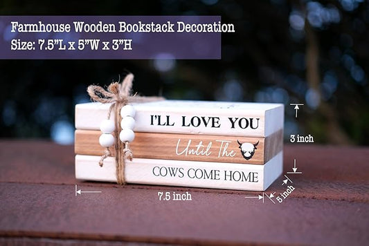 LIVDUCOT Highland Cow Wood Book Stacks Decor - Rustic Farmhouse Decorative Books Sign for Home Coffee Table Mantle Fireplace Shelf Decorations - I'll Love You Until the Cows Come Home 7.5x5x3'