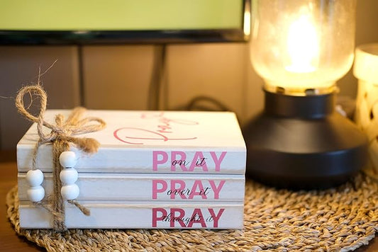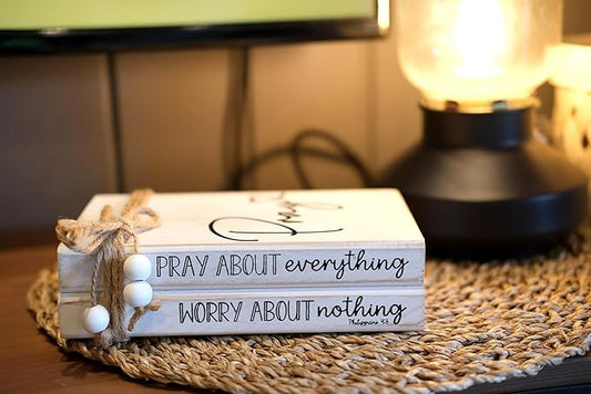 LIVDUCOT Faux Books for Christian Decoration, Decorative Wooden Book Stack for Bible Verse Home Decor - Pray About Everything Worry About Nothing Sign