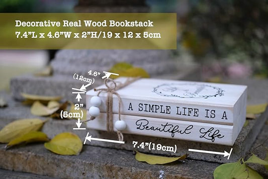 LIVDUCOT Decorative Books for Home, White Faux Books for Decoration, Rustic Farmhouse Display Wood Book Stack Coffee Table Decor Set of 2 (A Simple Life Is A Beautiful Life)