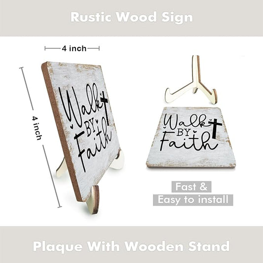 Motivational Sign Rustic Desk Decor Decorative Christian Gifts Religious Bible Verse Faith Decoration for Home Living Room Office Table Shelf Tiered Tray Plaque with Wood Stand