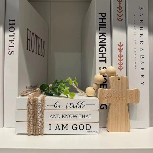 Mini Christian Book Stack, ReligiousTiered Tray Decor, Be Still and Know That I Am God Psalm 46:10, Wooden Bible Verse Stacked Books with Bead Tassels and Cross (daztbible06)
