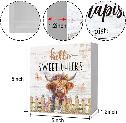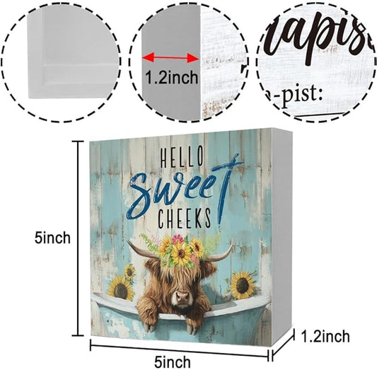 Rustic Bathroom Decor Farmhouse Hello Sweet Cheeks Wooden Sign, Toilet Rules Decoration for Farmhouse Apartment Shelves Toilet Restroom Home Tabletop Desk, Modern Toilet Shelves Accessory (Highland Cow)
