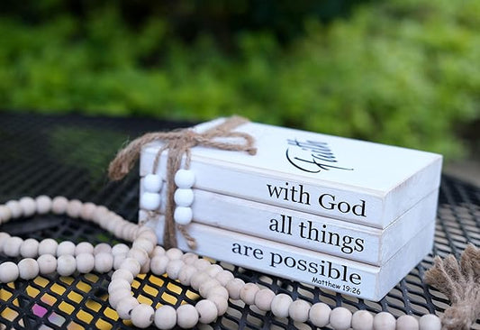 LIVDUCOT Farmhouse Wooden Decor Book Stack | Rustic Faux Book Stacks | With God All Things Are Possible Sign