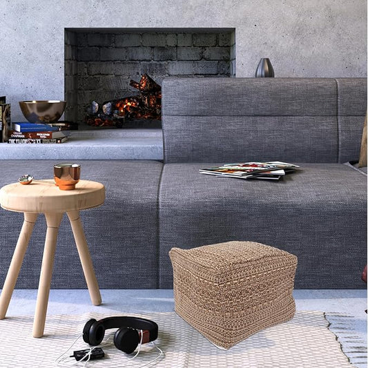 Unstuffed Pouf Ottoman Cover Soft Storage Extra Seat Farmhouse Comfortable Bohemian Poufs Accent Footrest 20x20x8 Inches for Living Room Bedroom Study Nook (Beige B, Square)