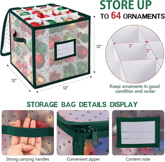 BINSUNS Christmas Ornament Storage Box, Christmas Storage Containers Organizer Bag with Dividers - Fits up to 64 Holiday Xmas Ornaments Decorations 3" Seasons Balls(Green)