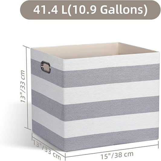 13x15x13 Storage Cube Bins, Foldable Storage Cubes, Fabric Organizer Basket Bin, Striped Containers Decorative Storage Boxes for Shelves Wardrobe Closet Home Office, 4 Pack, Gray/White