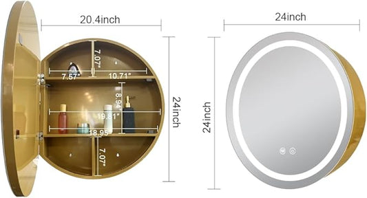 24inch Round Medicine Cabinet with Lights,Led Medicine Cabinet with Defogger,Illuminated Mirror Cabinet for Bathroom,Dimmable,Anti-Fog,3 Colors,Surface Mount Only,Gold