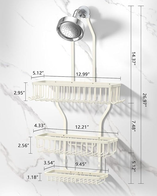 Shower Caddy Hanging - Never Rust Shower Hanging Organizer - Aluminum Over the ShowerHead Caddy with Soap Basket and 6 Hooks for Razor/Sponge (Milky White)