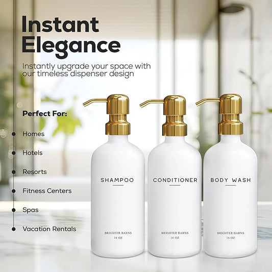 Luxury Shampoo and Conditioner Dispenser Set by Brighter Barns - Shower Soap Dispenser - Shampoo Conditioner Body Wash Dispenser & Pump - White and Gold Bathroom Accessories in Spa, Hotel, Gift (Gold)
