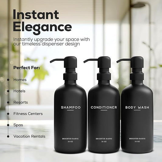 Black Shampoo and Conditioner Dispenser Set by Brighter Barns - Refillable Plastic Shower Soap Dispensers for Bathroom - Body Wash & Shampoo Bottles - Modern Bathroom Decor for Hotel, Airbnb (Black)