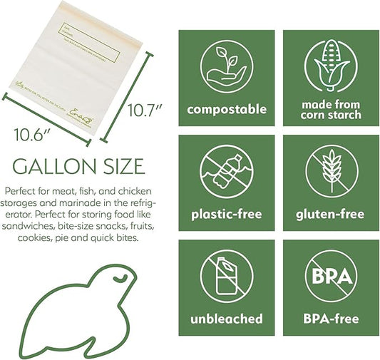 100% Compostable Food Storage Bags [Gallon 50 Pack] Eco-Friendly Freezer Bags, Resealable Bags, Heavy-Duty, Reusable, Off-White by Earth's Natural Alternative