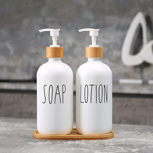 16oz Glass Soap Dispenser with Stainless Steel Pump, 21 Waterproof Labels, Non-Slip Protective Silicone Pad, Set of 2 for Bathroom & Kitchen (Matte White Bottle/Brushed Silver Pump)