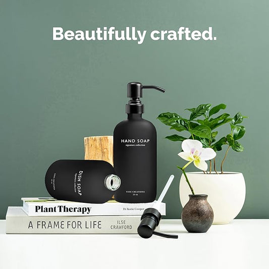 Vine Creations Black Glass Soap Dispenser Set, Dish Soap and Hand Soap Dispenser Set with Stainless Steel Pump, 16 oz Glass Dispensers for Kitchen Bathroom Decor (Matte Black Bottle/Matte Black Pump)