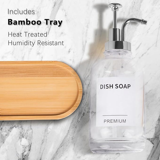 Dish Soap Dispenser for Kitchen, Hand Glass Soap Dispenser Set with Pump, Tray, Funnel for Bathroom, Shower, Laundry, Liquid, Lotion (Silver 2 Pack 18 Oz Clear Bottles with 12 Stickers)