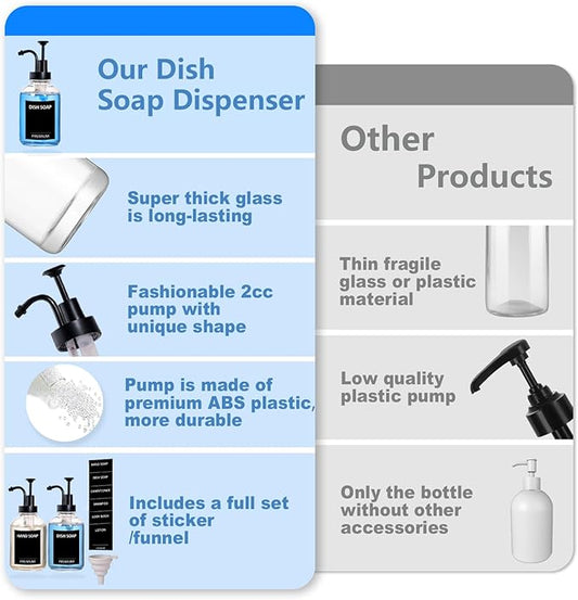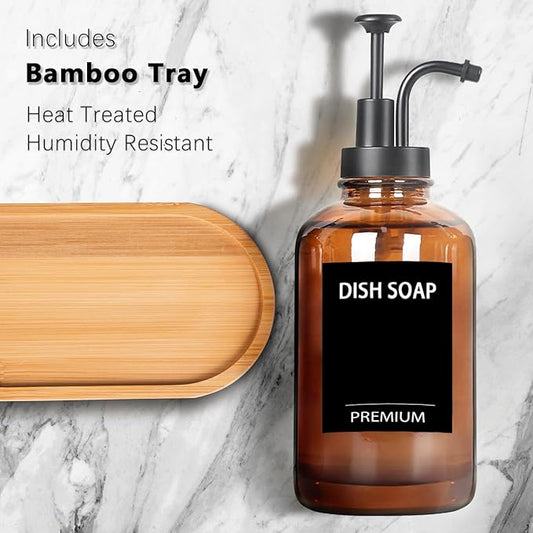 Amber 18 Oz Dish Soap Dispenser for Kitchen, Ultra-Thick Glass Soap Dispenser Set with Tray, Pump, Funnel for Bathroom, Liquid, Lotion, Shower, Laundry, (2 Pack with 12 Stickers)