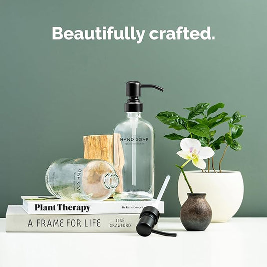 Vine Creations Clear Glass Soap Dispenser Set, Dish Soap and Hand Soap Dispenser Set with Stainless Steel Pump, 16 oz Glass Dispensers for Kitchen Bathroom Decor (Clear Bottle/Matte Black Pump)