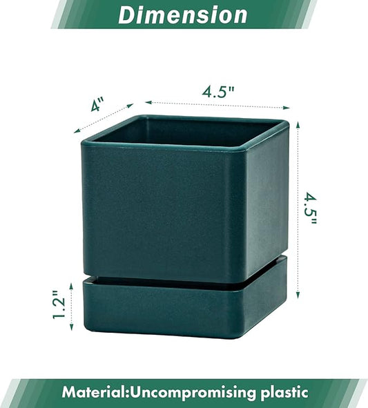 4 Inch Herb Planter Pot, Plastic Planter with Drainage Holes and Saucer, Modern Decorative Gardening Pot for Indoor Plants, Flowers, Herbs, Succulents, Green, Set of 4, 76-Y-C-4