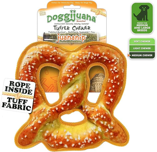 Doggijuana Tuffer Chewer Plush Dog Toy | Funny Dog Toy Plush with Juananip Catnip for Dogs | Calming Aid for Dogs | Interactive Squeaky Chew Toy for Play (Pretzel)