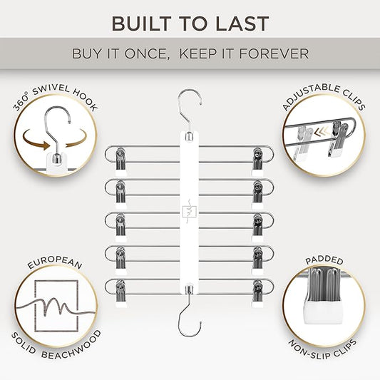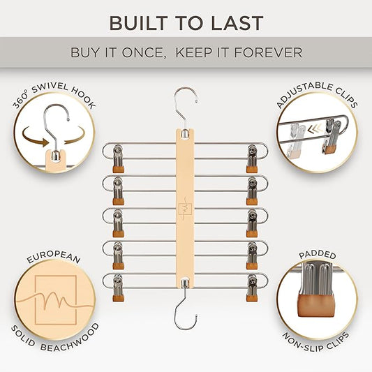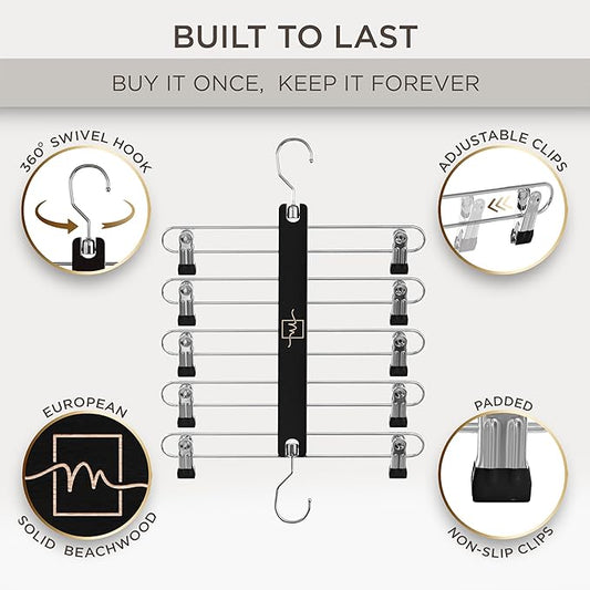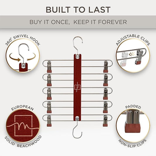 MORALVE Skirt Hangers Space Saving with Clips - 2 Pack - European Beechwood 5-Tier Hanger for Shorts, Skirts, and Pants - Closet Organizer and Storage Solution for Women with 360° Swivel Hook