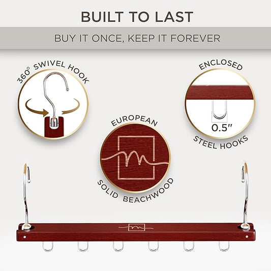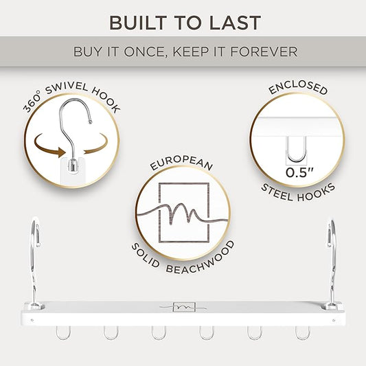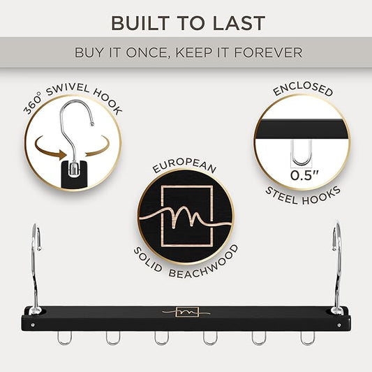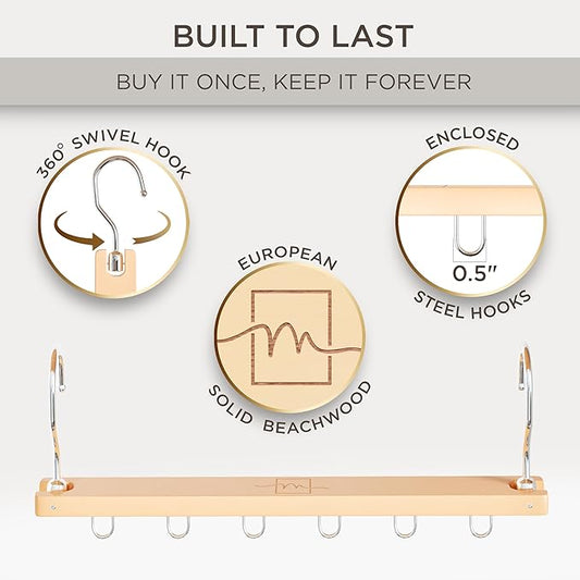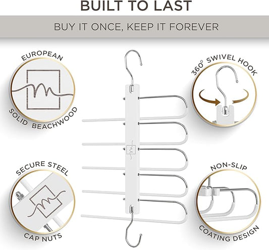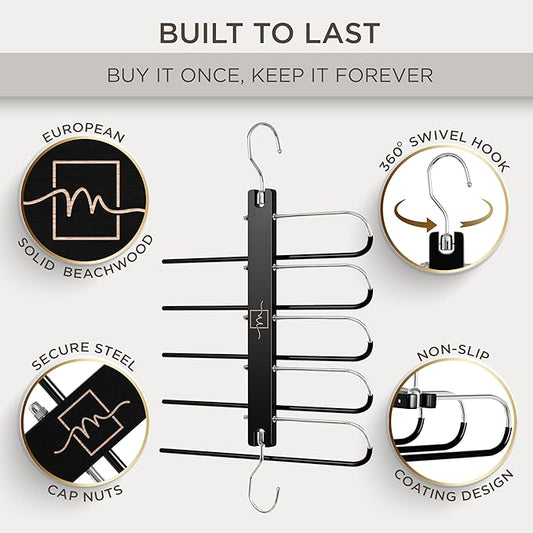 MORALVE Pants Hangers Space Saving - European Beechwood Scarf and Jean Hangers - Closet Organizer and Space Saver Pant Rack, Leggings Hanger, and Scarf Holder with 360° Swivel Hook (1 Pack)