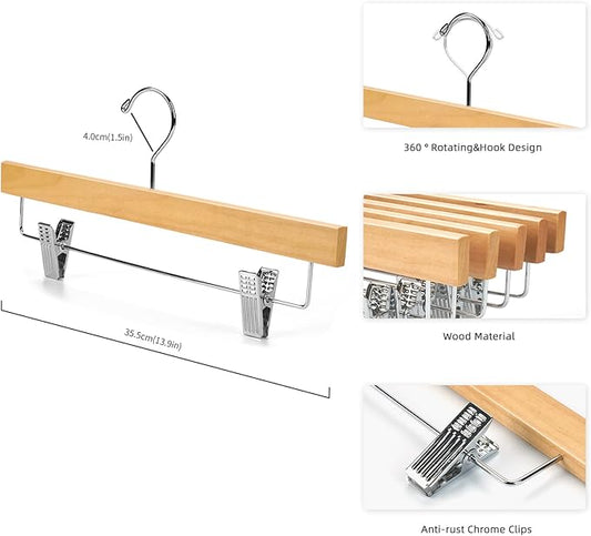 Amber Home 10 Pack Natural Wooden Pants Hangers with Clips, Wood Skirt Hangers Trouser Hangers for Jeans, Slacks, Shorts with 2-Adjustable Clips