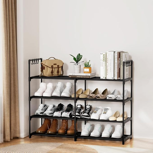2 Rows 4 Tier Shoe Rack, Black Metal Stackable Shoe Shelf with Multifunctional Hooks, Hold 16-20 Pairs, Space Saving Shoe Organizer for Closet, Bedroom