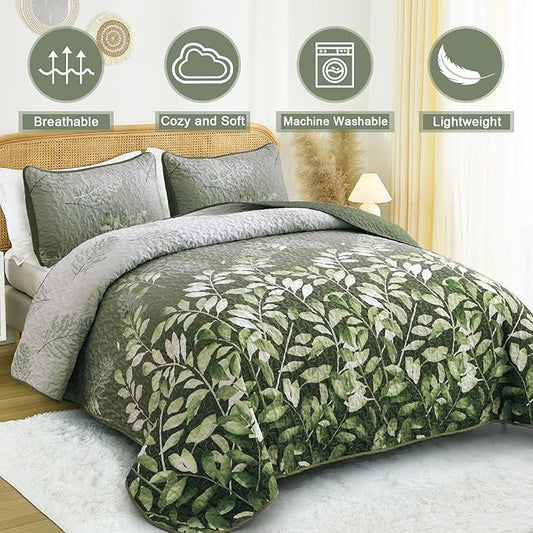 WONGS BEDDING Olive Green Quilt Set King Size,3 Pieces Botanical Leaves Printed Bedspread Coverlet Set,Microfiber Floral Bedding Set for All Season 104"x90"