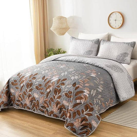 WONGS BEDDING Brown Floral Quilt Set King Size,3 Pieces Botancal Leaves Bedspread Coverlet Set with 2 Pillowcases for All Season, Soft Microfiber Floral Bedding Set 104"×90"
