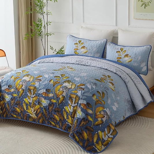 WONGS BEDDING 3 Pieces Quilt Set Queen Size, Blue-Gold Floral Bedspread Coverlet Set, Soft Microfiber Lightweight Floral Bedding Set King 104"×90"