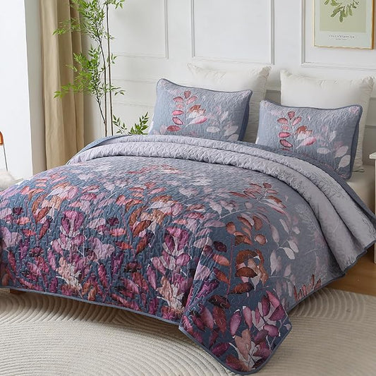 WONGS BEDDING Purple Floral Quilt Set Queen Size, 3 Pieces Botancal Leaves Bedspread Coverlet Set with 2 Pillowcases for All Season, Soft Microfiber Floral Bedding Set 96"×90"
