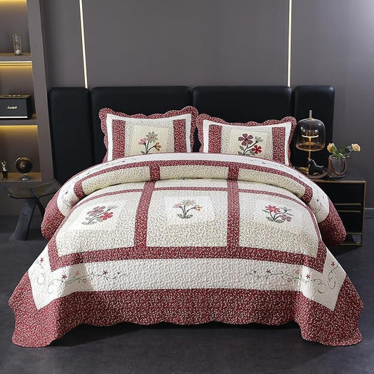 vctops Christmas Red 2 Piece Embroidered Floral Quilted Bedspread Quilt Set 100% Cotton Reversible Patchwork Coverlet Set 1 Quilt and 1 Pillow Sham (Red,Twin)