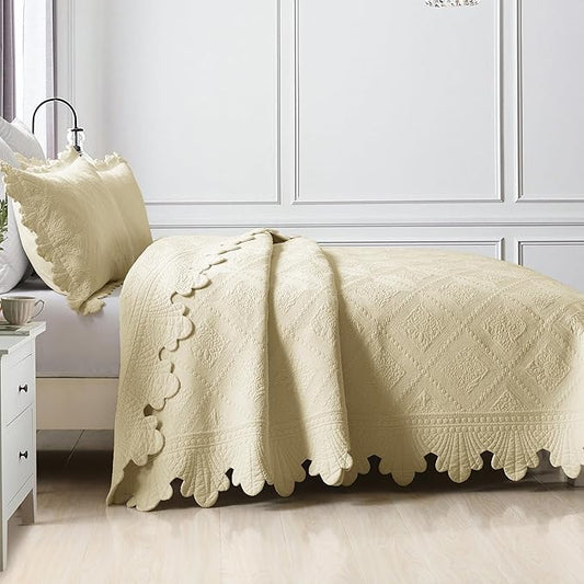 MarCielo 3-Piece 100% Cotton Oversized Bedspread Lightweight Quilt Coverlet Embroidery Farmhouse Bedding Set T0 (Yellowish Beige, Oversized King (118"x106"))
