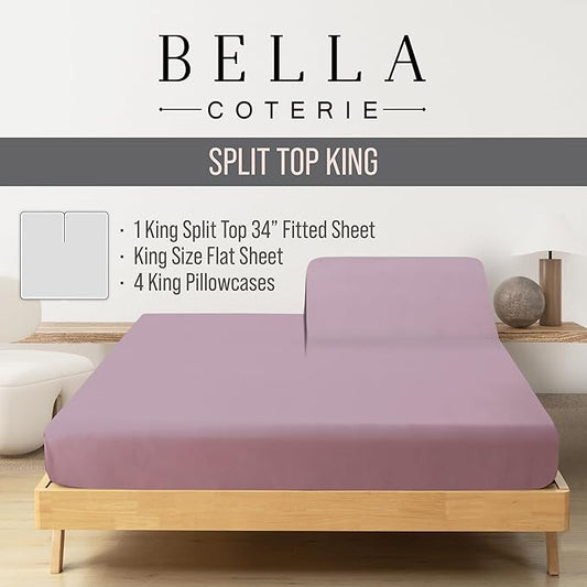 Bella Coterie 6 Piece Luxury Bamboo Viscose Split Top King Size Sheet Set | 34" Split for Adjustable Beds | 100% Organically Grown| Cooling | 18” Deep Pocket | 4 Pillowcases [Lilac]