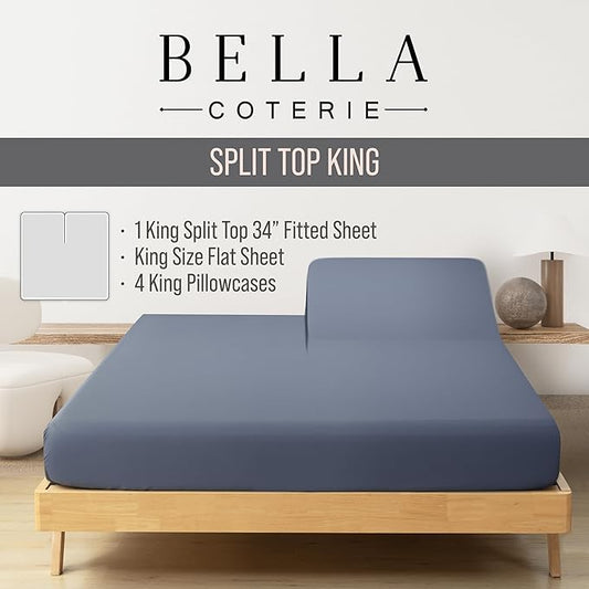 Bella Coterie 6 Piece Luxury Bamboo Viscose Split Top King Size Sheet Set | 34" Split for Adjustable Beds | 100% Organically Grown| Cooling | 18” Deep Pocket | 4 Pillowcases [Slate Blue]