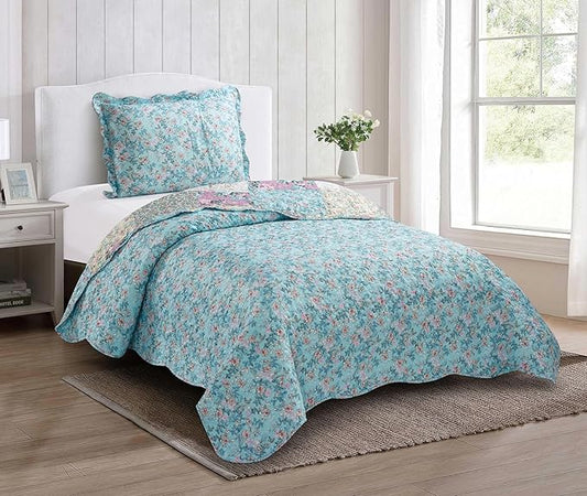 Brilliant Sunshine Lilac Rose Toile Quilt Set, 2-Piece Bedding Sets, Traditional Lively Patchwork Design, Washable, Reversible Bedspread, Soft Lightweight Coverlet, All-Season, Twin/Twin XL, Egg Blue
