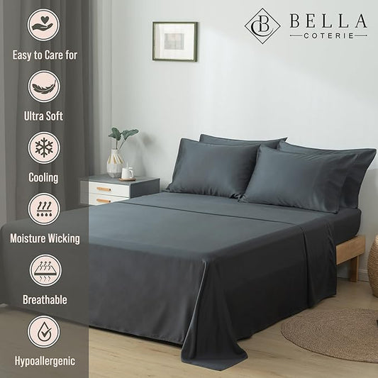 Bella Coterie 6 Piece Luxury Bamboo Viscose King Size Sheet Set | 100% Organically Grown | Cooling for Hot Sleepers | 18" Deep Pocket | Soft & Hypoallergenic | 4 Pillowcases [Charcoal Grey]